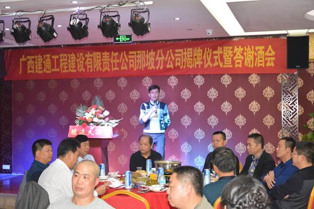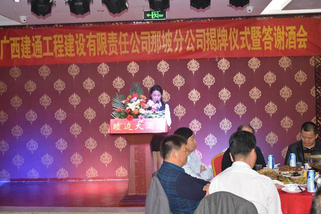 在慶典晚宴上,首先由廣西建通工程建設(shè)有限責(zé)任公司那坡分公司總經(jīng)理王曉玲發(fā)表致辭,她說(shuō):“德建志遠(yuǎn),業(yè)通人和”是我們集團(tuán)最新提出的發(fā)展口號(hào),廣西建通投資集團(tuán)是一個(gè)朝氣蓬勃,充滿(mǎn)活力,富有想象力和創(chuàng)造力的企業(yè),集團(tuán)培養(yǎng)了我們誠(chéng)信的為人之道,求實(shí)的工作作風(fēng)。分公司將致力加強(qiáng)對(duì)員工道德品質(zhì)的培養(yǎng),加強(qiáng)對(duì)員工專(zhuān)業(yè)能力、服務(wù)質(zhì)量的把控,發(fā)揚(yáng)團(tuán)隊(duì)精神,為集團(tuán)品牌建設(shè)及戰(zhàn)略發(fā)展目標(biāo)添磚加瓦。一如既往秉承“以質(zhì)量求信譽(yù),以信譽(yù)求發(fā)展”的理念,為投資者和項(xiàng)目業(yè)主提供專(zhuān)業(yè)化、高水準(zhǔn)、全方位的服務(wù),以專(zhuān)業(yè)化的管理做強(qiáng)分公司、做大建通品牌為已任,抓住機(jī)遇!共同努力在建通平臺(tái)上實(shí)現(xiàn)更高的人生價(jià)值,我公司熱忱地期望能與社會(huì)各界新老朋友精誠(chéng)合作、攜手共進(jìn),創(chuàng)造更加輝煌的未來(lái)。