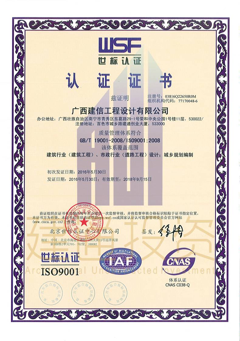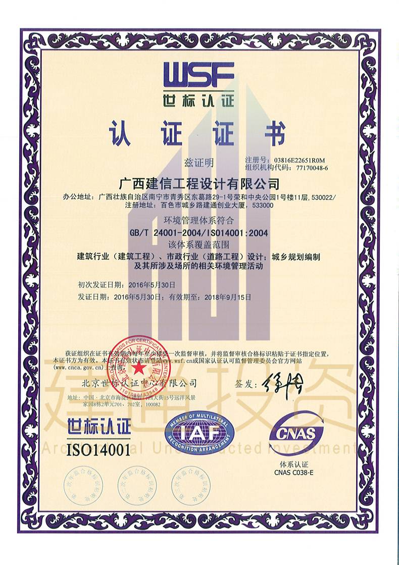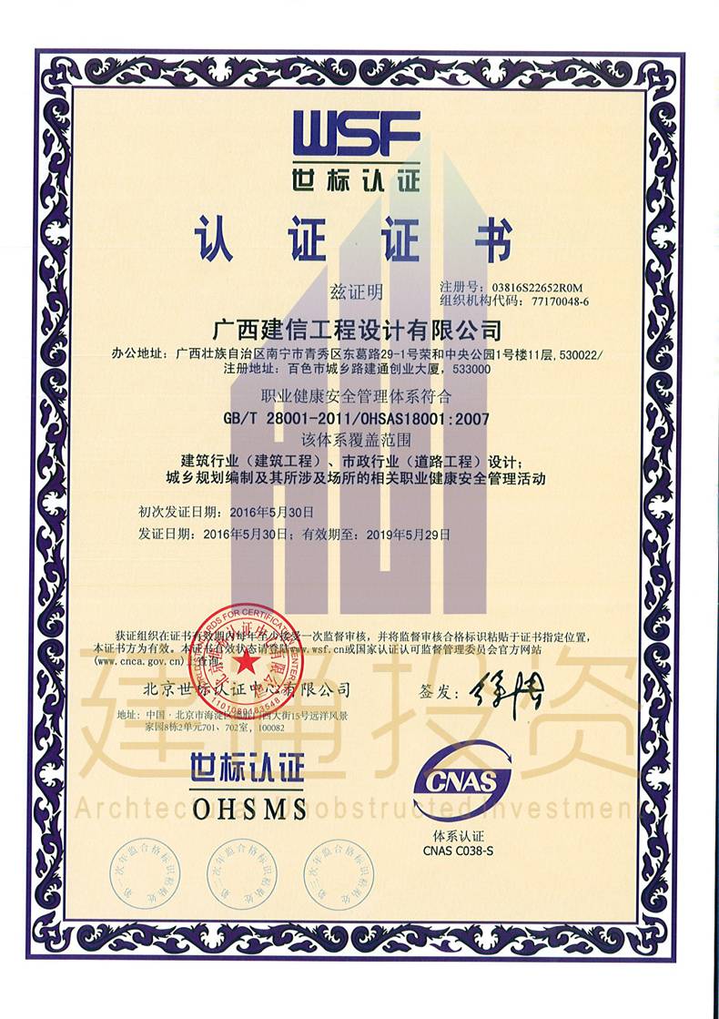 廣西建信工程設(shè)計(jì)有限公司三大體系認(rèn)證證書