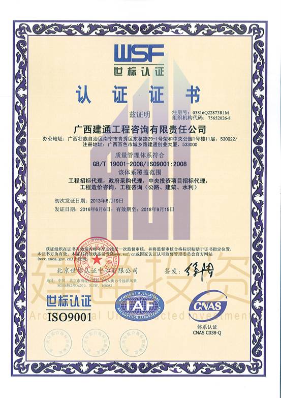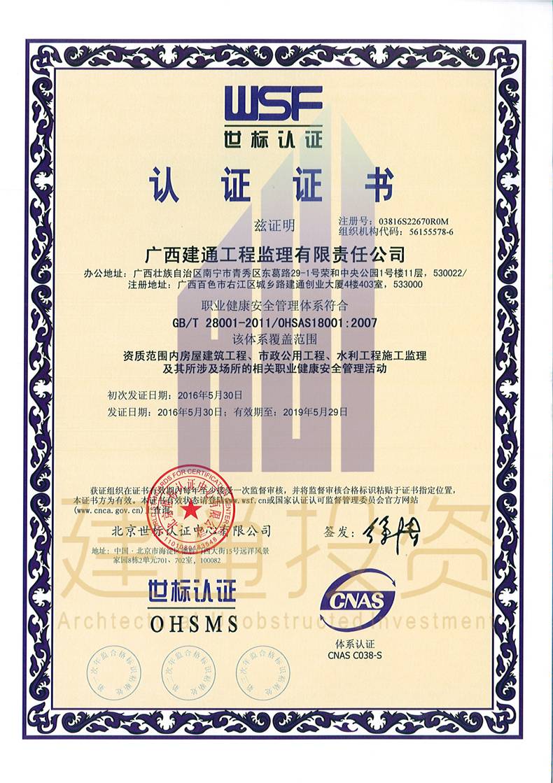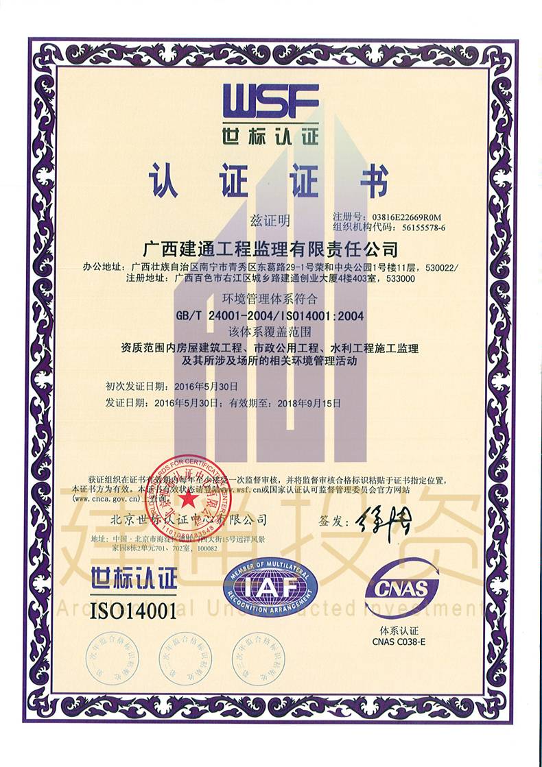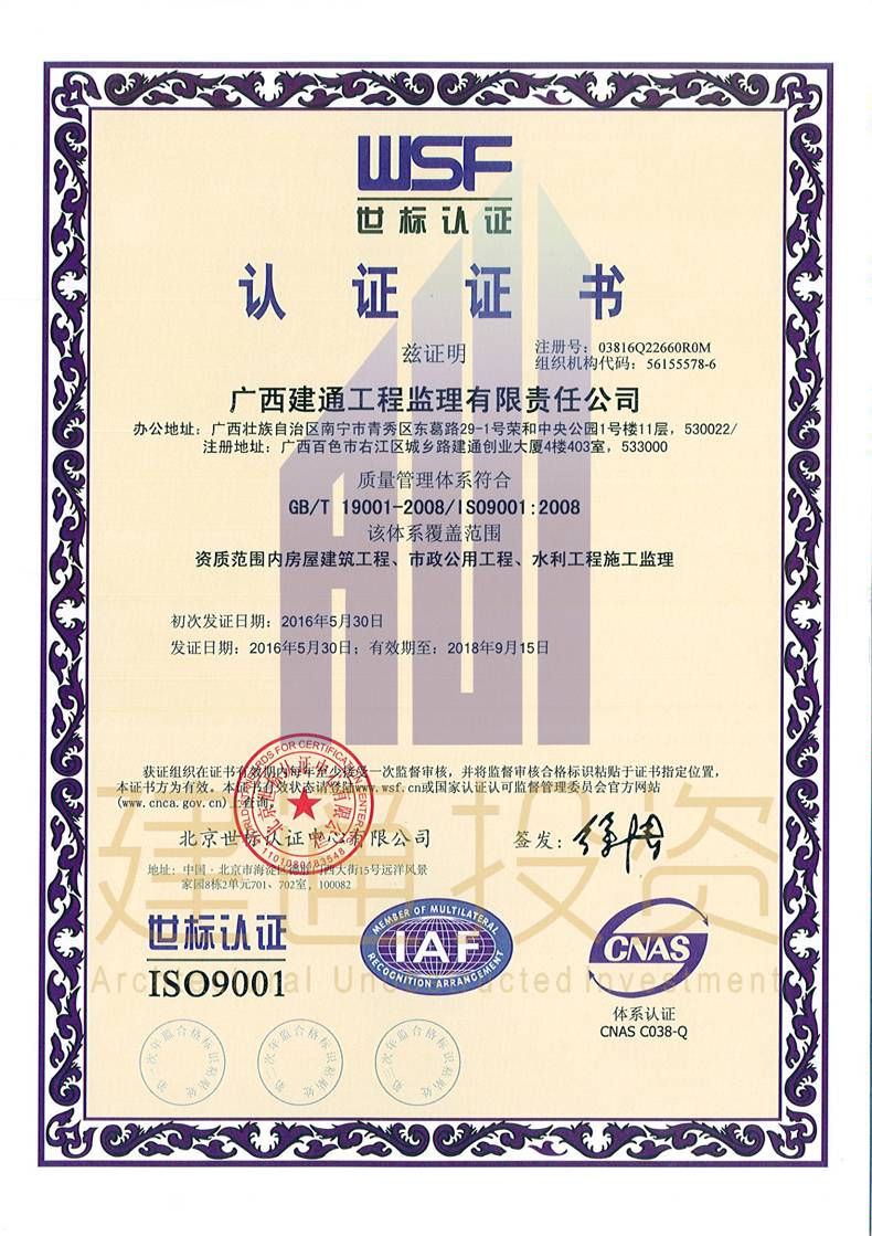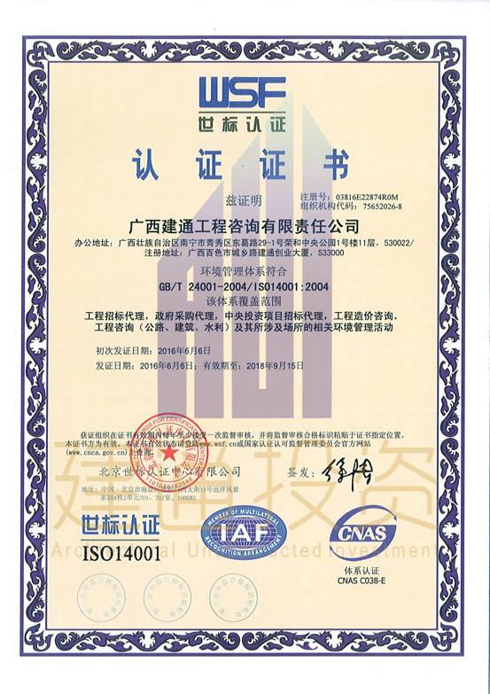 廣西建通工程監(jiān)理有限責(zé)任公司三大體系認(rèn)證證書