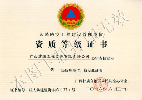 根據(jù)國(guó)家人防辦《人防工程監(jiān)理行政許可資質(zhì)管理辦法》以及《廣西壯族自治區(qū)人民防空行政審批操作規(guī)范》等有關(guān)規(guī)定,廣西建通工程監(jiān)理有限責(zé)任公司人防工程監(jiān)理丙級(jí)資質(zhì)證書在有效期屆滿后,及時(shí)向自治區(qū)人防主管部門提交資質(zhì)延續(xù)申請(qǐng)材料,并于2016年6月30日成功獲得新頒發(fā)的人防工程監(jiān)理丙級(jí)資質(zhì)證書。該資質(zhì)業(yè)務(wù)范圍為:本行政區(qū)域內(nèi)抗力等級(jí)6級(jí)、6B級(jí)及建筑面積1萬平方米以下的人防工程監(jiān)理業(yè)務(wù), 證書有效期至2017年8月30日。