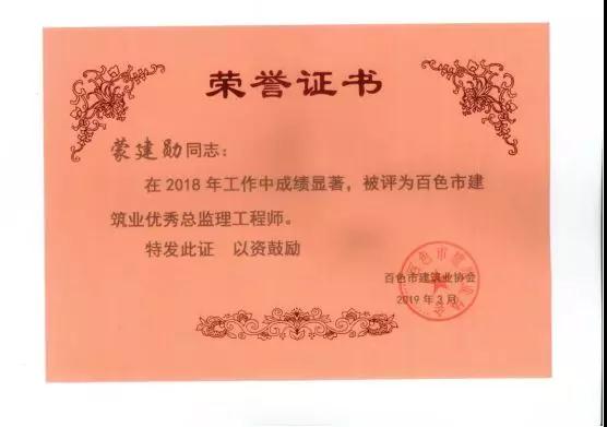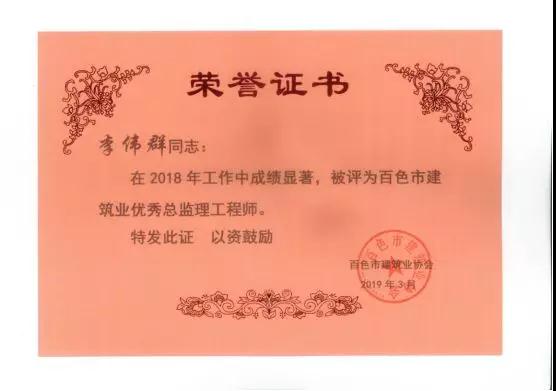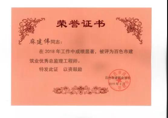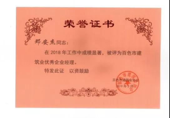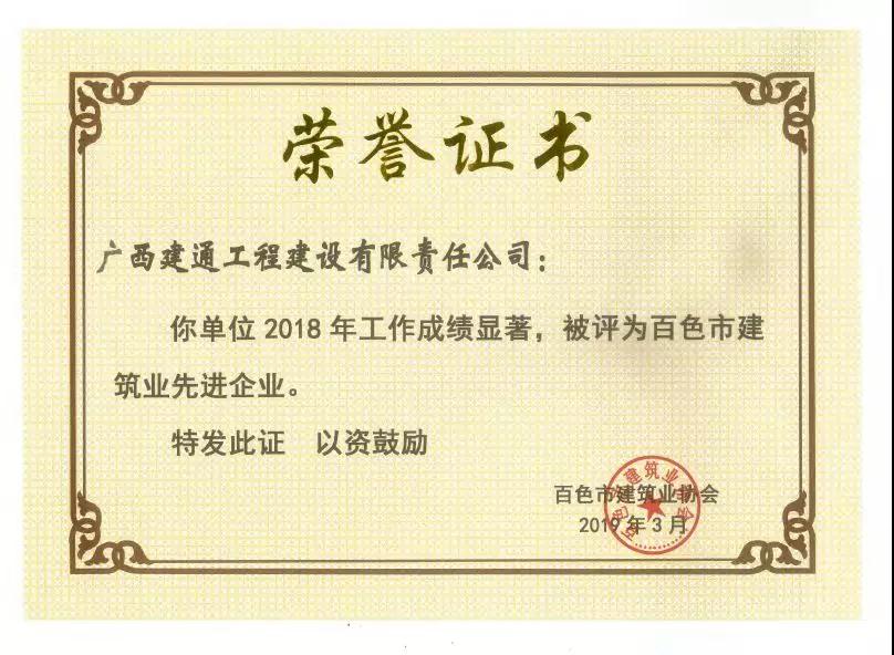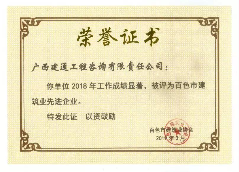 一、廣西建通工程咨詢有限責任公司榮獲《2018年度百色市建筑業(yè)先進企業(yè)》、鄧董事長榮獲《2018年度百色市建筑業(yè)優(yōu)秀企業(yè)經(jīng)理》榮譽稱號;