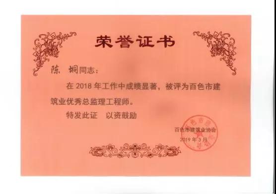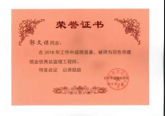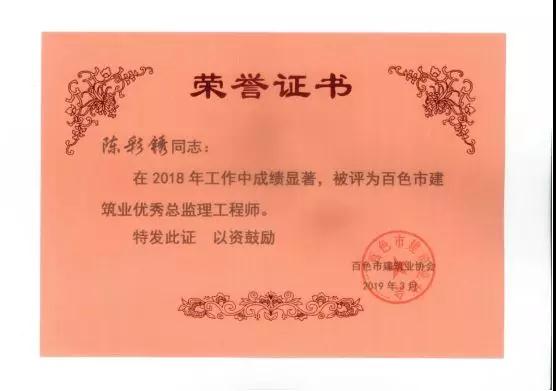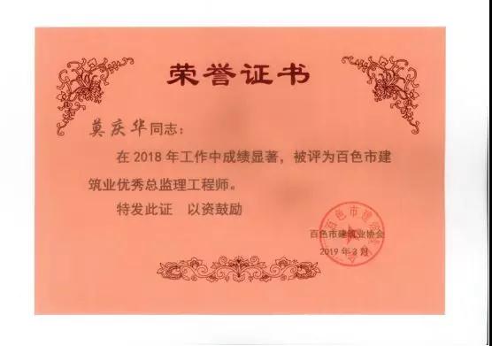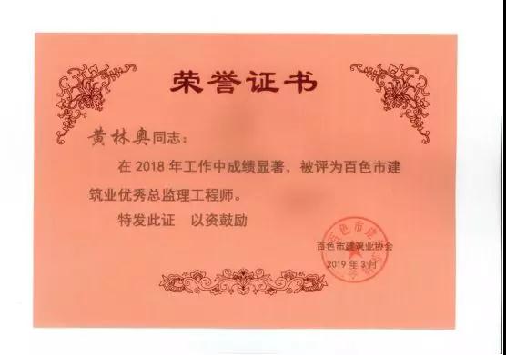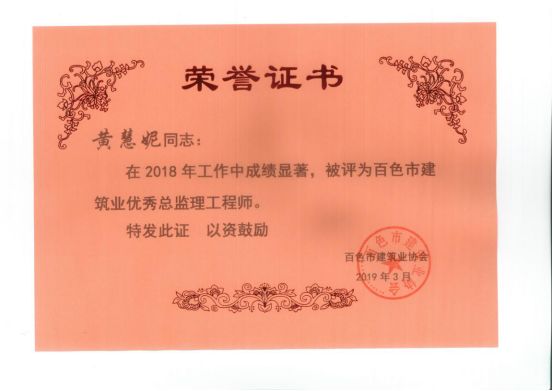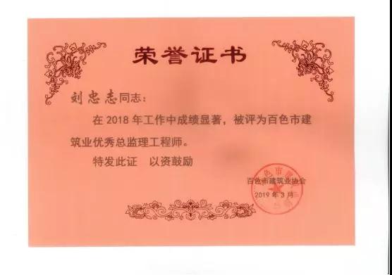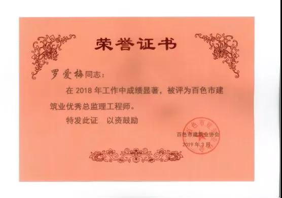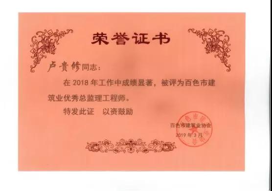 三、廣西建通工程監(jiān)理有限責任公司名下技術(shù)總監(jiān):劉忠志、蒙建勛、黃承理、趙科亮、麻建偉、盧貴修、黃慧妮、陳 垌、蘇海洋、羅愛梅、陳彩繡、黃林奧、莫慶華、李偉群、郭文保等15位榮獲《2018年度百色市優(yōu)秀總監(jiān)理工程師》榮譽稱號;