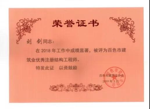 四、廣西建信工程設(shè)計有限公司榮獲《2018年度百色市建筑業(yè)先進企業(yè)》、韋霖榮獲《2018年度百色市勘察設(shè)計優(yōu)秀注冊建筑師》、劉劍榮獲《2018年度百色市勘察設(shè)計優(yōu)秀注冊結(jié)構(gòu)師》、楊瑩、鄧志權(quán)榮獲《2018年度百色市勘察設(shè)計優(yōu)秀工程師》的榮譽稱號。