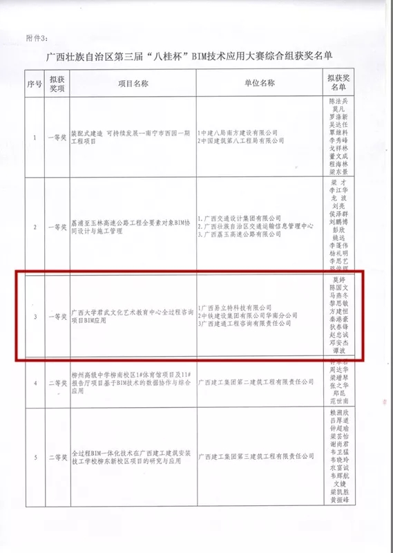 本項賽事為區(qū)內影響力頗高的BIM大賽,是面向大部分勘察設計、施工企業(yè)的業(yè)界實力比拼,具有廣泛影響力。本次大賽共收到來自全區(qū)設計、施工、綜合、院校、單項5個組別的103項成果參賽。經過各方面的激烈角逐,我公司最終在多個項目中脫穎而出,喜摘綜合組一等獎,本年度再一次斬獲“八桂杯”全區(qū)BIM大賽獎項,也標志著我公司BIM技術應用達到了行業(yè)先進水平。